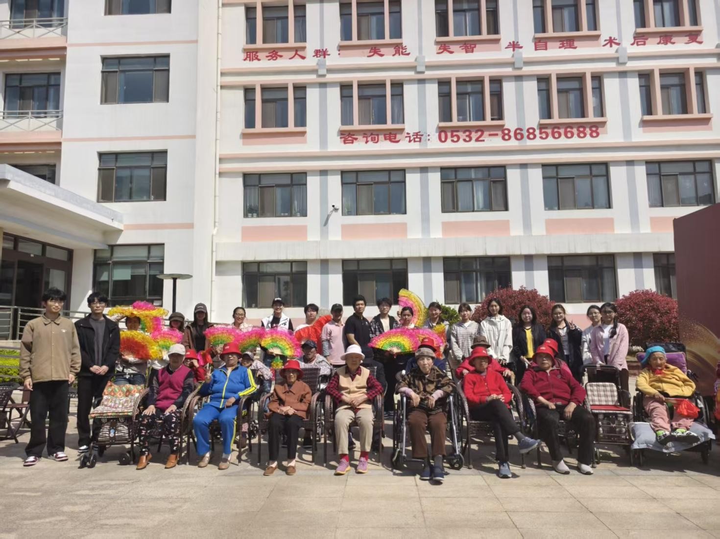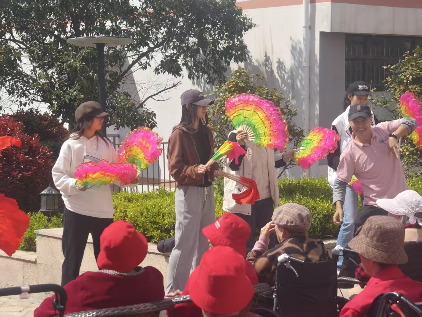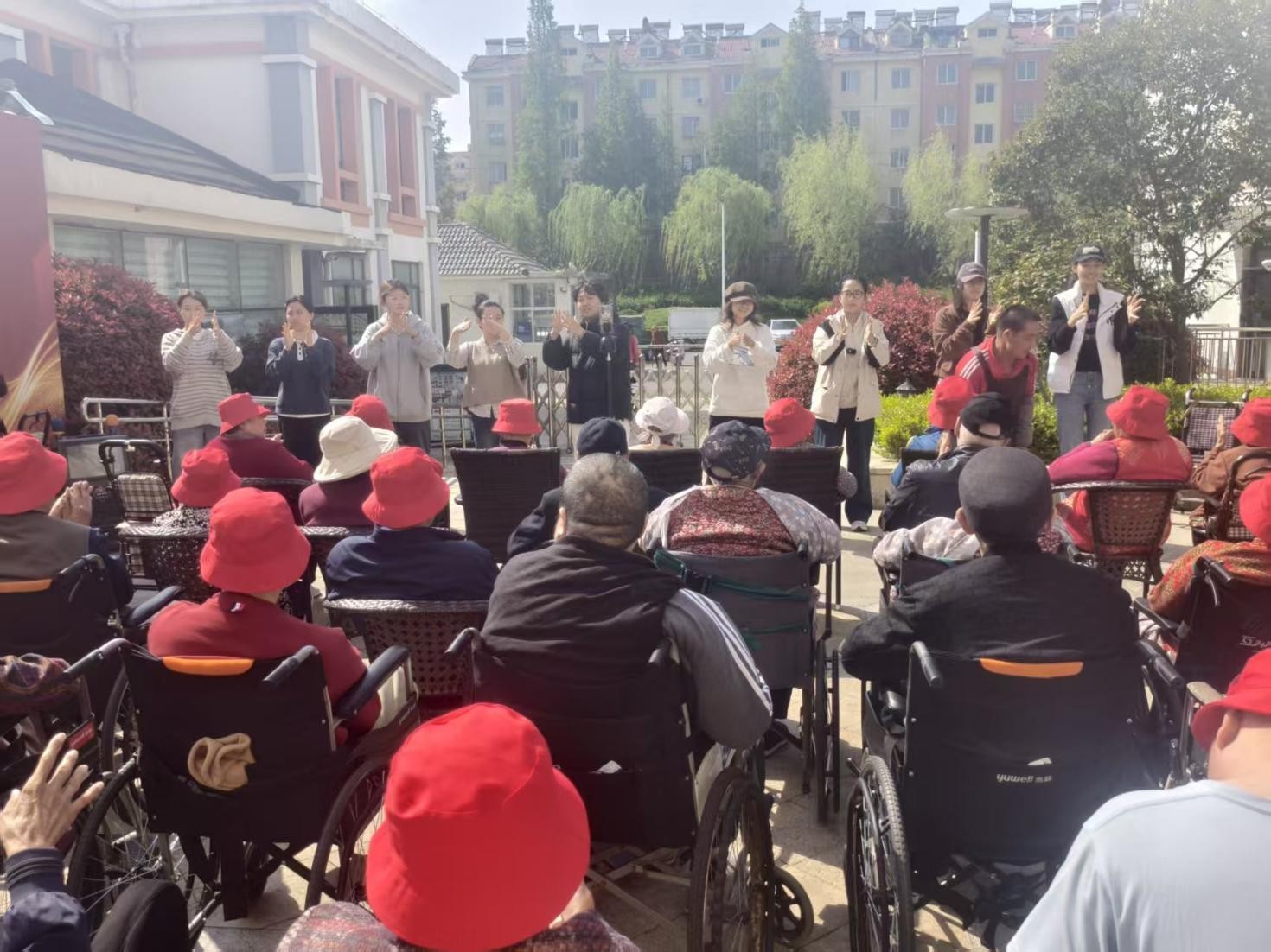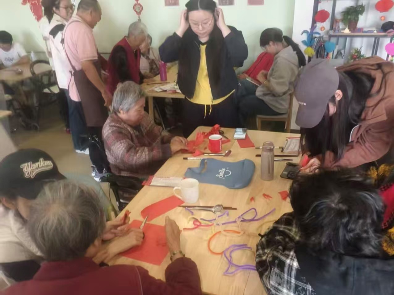 本次活动设置陪伴交流、爱心帮扶、文艺表演、手工互动及赠送慰问品等多个环节。抵达养老院后,志愿者们迅速布置场地,并分组开展活动。其中,帮扶组志愿者主动走近老人,与他们亲切交流、耐心聆听心声,并陪伴他们散步聊天;在文艺表演环节中,志愿者们与老人热情互动,一同打着节拍、合唱多首经典老歌;手工互动环节时,志愿者耐心引导、协助老人制作折纸花与毛绒挂饰,大家兴致盎然,现场氛围温馨融洽。最后,志愿者们将亲手书写祝福的贺卡送至每位老人手中,并与他们合影留念,以此定格温暖瞬间。