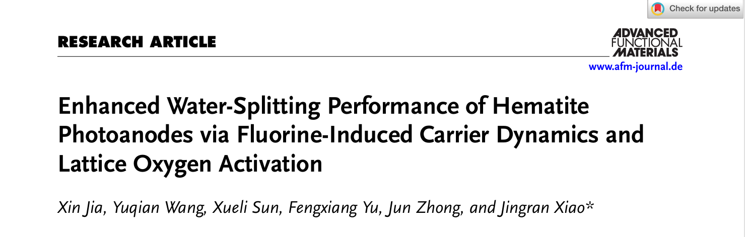 2023级硕士研究生贾鑫。相关成果以“Enhanced Water-Splitting Performance of Hematite Photoanodes via Fluorine-Induced Carrier Dynamics and Lattice Oxygen Activation”为题发表在国际知名学术期刊《Advanced Functional Materials》上(中科院一区Top,影响因子:19)。